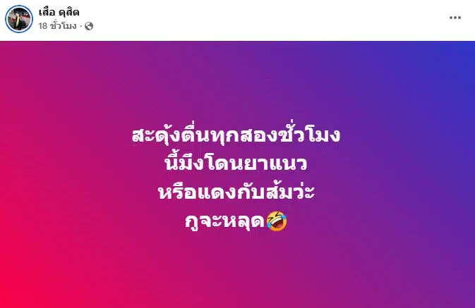 โพสต์ต่อมา ระบุว่า “สะดุ้งตื่นทุกสองชั่วโมง นี้มึงโดนยาแนวหรือแดงกับส้มว่ะ กูจะหลุด” จากนั้น โพสต์ต่อว่า “ควรไปโรงพยาบาลครับไม่ใช่โรงพักและต้องมีใบรับรองแพทย์นะคับพ่อบ้านกสิกร