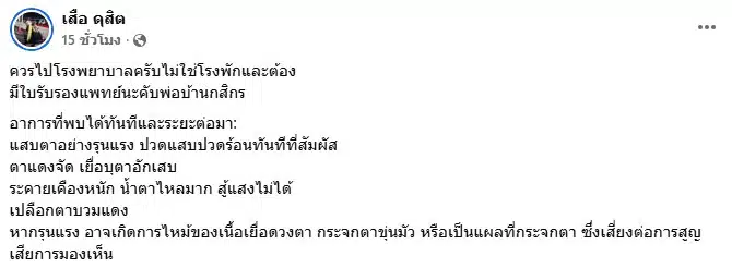 อาการที่พบได้ทันทีและระยะต่อมา: แสบตาอย่างรุนแรง ปวดแสบปวดร้อนทันทีที่สัมผัส ตาแดงจัด เยื่อบุตาอักเสบ ระคายเคืองหนัก น้ำตาไหลมาก สู้แสงไม่ได้ เปลือกตาบวมแดง หากรุนแรง อาจเกิดการไหม้ของเนื้อเยื่อดวงตา กระจกตาขุ่นมัว หรือเป็นแผลที่กระจกตา ซึ่งเสี่ยงต่อการสูญเสียการมองเห็น”