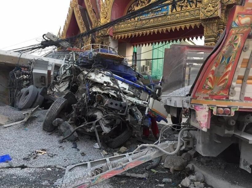 เละเต็มหน้าวัด! สิบล้อพ่วงพุ่งเสยท้ายกันหน้าวัด พังยับ คนขับดับ 1