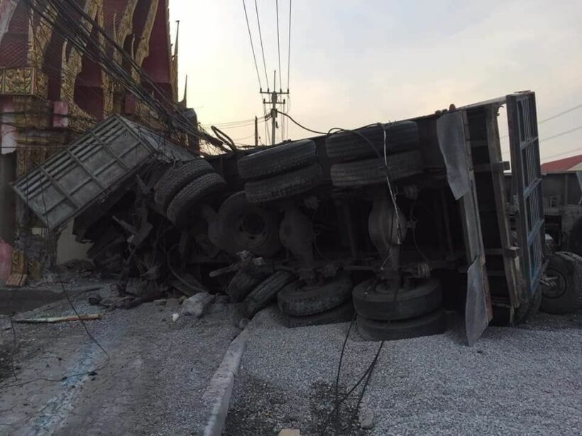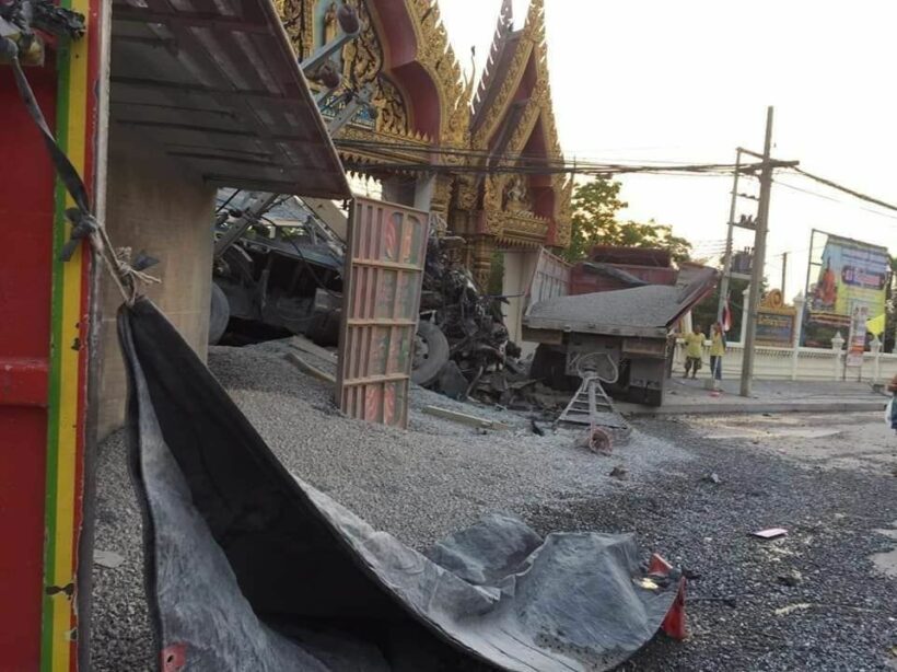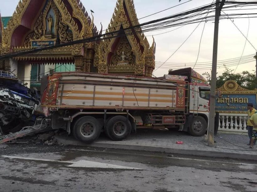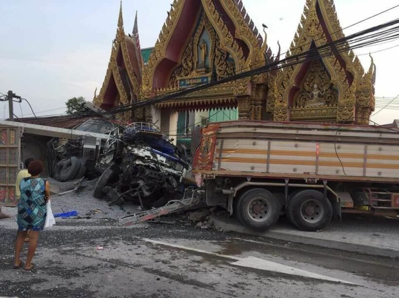 เละเต็มหน้าวัด! สิบล้อพ่วงพุ่งเสยท้ายกันหน้าวัด พังยับ คนขับดับ 1