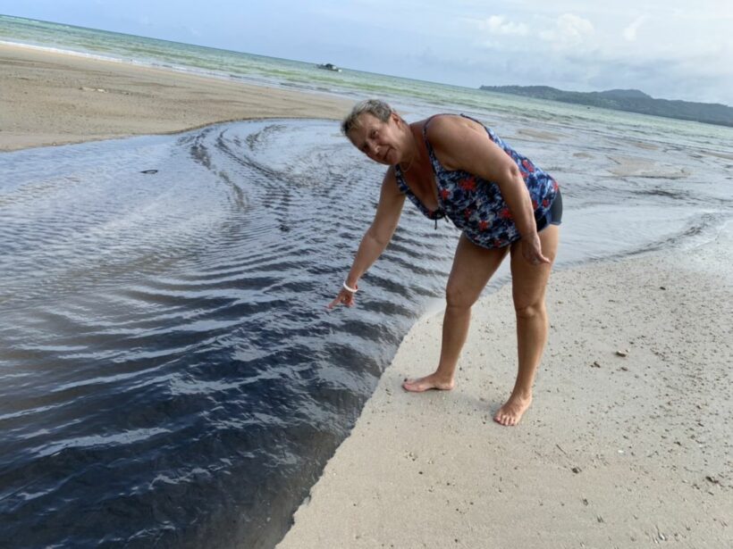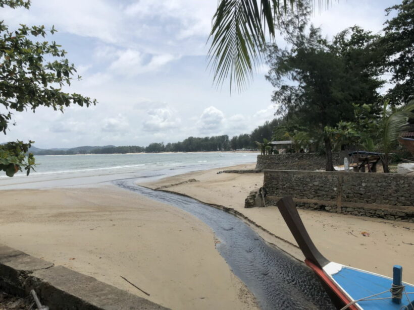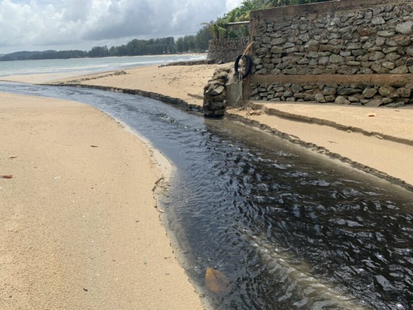 น้ำเน่าหาดบางเทาโผล่อีก ไหลลงชายหาด ส่งกลิ่งฟุ้งทั่วบริเวณ