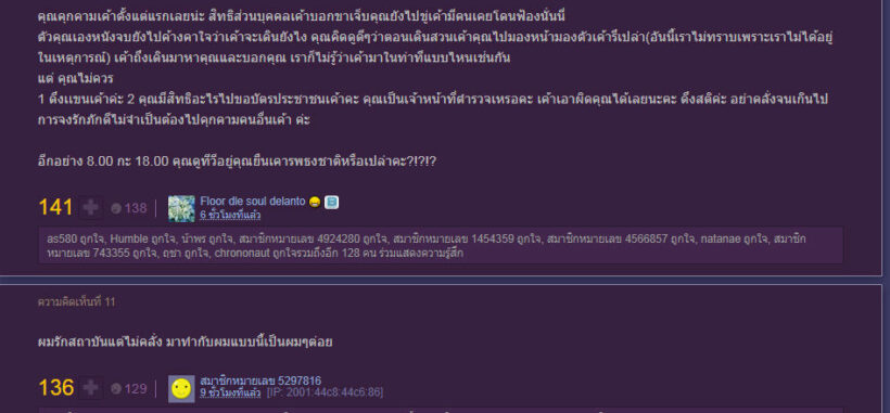 และผมก็ขอบัตรประชาชนเธอ เพื่อที่จะเอาไปแจ้งความตามที่เธอขอ แต่เธอก็ไม่ให้ ระหว่างนั้นผมก็พูดประมาณว่า เป็นคนไทยซะป่าว ยืนแค่ 1 นาทียังทำไมได้เลย เราสองคนเถียงกันไปเถียงกันมา เธอก็ยังคงพูดให้แจ้งความเป็นระยะๆ จนผมต้องโทรหา 191 เพื่อแจ้งความตามที่เธอท้า