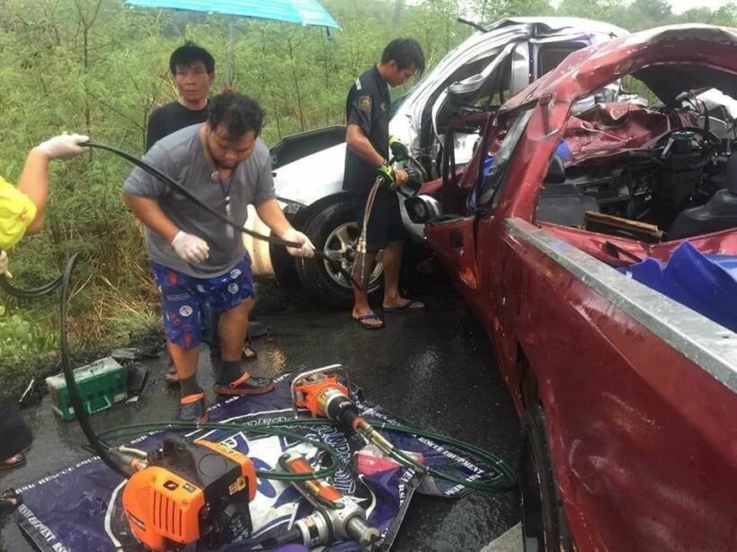 วานนนี้เวลาประมาณ 18.00 น. เจ้าหน้าที่ สภ.ด่านช้าง จ.สุพรรณบุรี ได้รับแจ้งมีอุบัติเหตุ รถกระบะเสียหลักชนกัน และผู้เสียชีวิตและบาดเจ็บติดอยู่ภายในรถหลายราย จึงเร่งระดมกำลังเจ้าหน้าที่เข้าให้การช่วยเหลือ