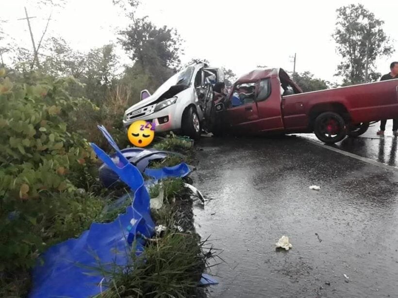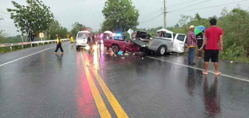 สุพรรณบุรี – กระบะอบต. เสียหลักพุ่งข้ามฝั่งชนดีแม็กซ์ พังยับ ดับ 2 เจ็บ 2