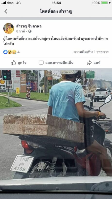 จากกรณีเมื่อเวลา 16.46 น. ของวันที่ 15 พ.ค.62 ได้มีผู้ใช้เฟชบุ๊ค สำราญ จินดาพล โพสต์ ภาพนิ่ง ขณะที่ชายวัยรุ่นขี่รถจักรยานยนต์ได้วางฝาคูระบายที่เบาะหลังรถฯแล้วนำไปขายที่ร้านขายของเก่า พร้อมระบุข้อความว่า ผู้ใดพบเห็นชี้เบาะแสบ้านอยู่ตรงไหนแจ้งด้วยครับฝาคูระบายน้ำที่หายไปครับ หลังจากที่มีการโพสต์แล้ว ได้มี น.ส.จินณพัช อุดมศรี อายุ 37 ปี ที่อยู่ 61/229 ม.1 ต.วิชิต อ.เมืองภูเก็ต ได้ประสานไปยัง นายสำราญ จินดาพล นายกเทศมนตรีเทศบาลตำบลฉลอง ซึ่งเป็นผู้โพสต์ภาพและข้อความดังกล่าว โดยให้ข้อมูลว่า ขณะที่ขับรถไปทำงาน พบเห็นชายไทยอายุ ประมาณ 30-35 ปี ขับรถจักรยานยนต์ ยี่ห้อฮอนด้า รุ่นเวป 110 หมายเลขทะเบียน 1 กฆ 4109 ภูเก็ต กำลังจอดติดไฟแดงอยู่ที่ปากซอยเทพอนุสรณ์ ถ.เจ้าฟ้าตะวันตก ต.วิชิต อ.เมือง จ.ภูเก็ต ซึ่งกำลังบรรทุกฝาตะแกรงเหล็กปิดท่อระบายน้ำ ขนาด 0.50*0.50 เมตร จำนวน 2 อัน จึงได้ใช้โทรศัพท์มือถือของตนถ่ายรูปไว้เป็นหลักฐาน เนื่องจากก่อนหน้านั้นได้มีฝาตะแกรงเหล็กปิดท่อระบายน้ำ ซึ่งเป็นทรัพย์สินของเทศบาลตำบลฉลอง อ.เมืองภูเก็ต จังหวัดภูเก็ต สูญหายบริเวณ ซอยเจ้าฟ้า 77 (ซอยน้าไชย) ม.5 ต.ฉลอง อ.เมือง จ.ภูเก็ต จึงสงสัยว่า บุคคลดังกล่าวนั้นอาจจะเป็นคนที่ลักขโมยไป จึงได้ถ่ายรูปไว้เป็นหลักฐาน ต่อมา นายสำราญ จินดาพล จึงได้ประสานมายังเจ้าหน้าที่ชุดสืบสวนกองกำกับการสืบสวนภูธรจังหวัดภูเก็ต เพื่อทำการตรวจสอบ