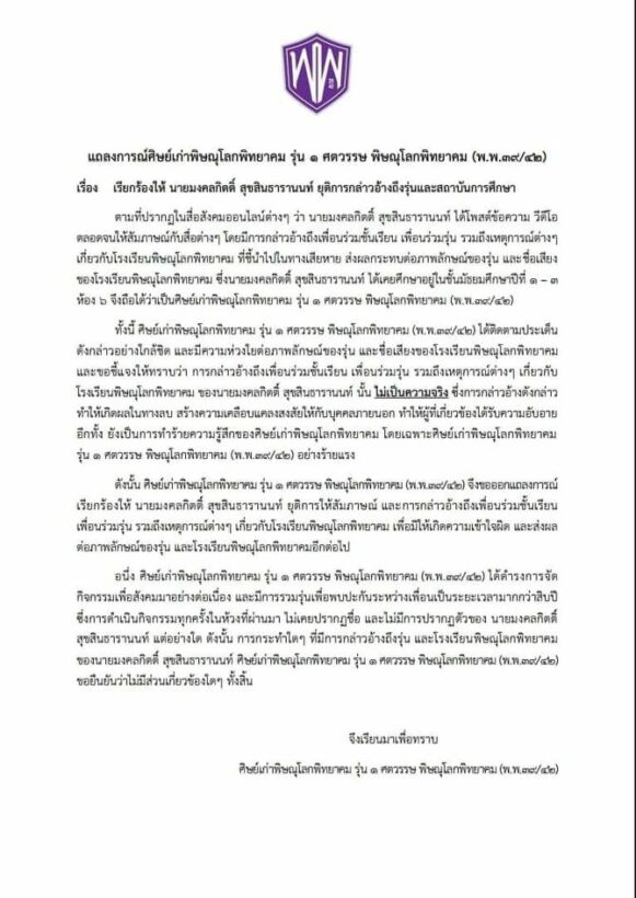 คืบหน้าล่าสุด ศิษย์เก่าพิษณุโลกพิทยาคม รุ่น 1 ศตวรรษ พิษณุโลกพิทยาคม (พ.ศ.39/42) ได้ออกแถลงการณ์ เรื่อง เรียกร้องให้นายมงคลกิตติ์ สุขสินธารานนท์ ยุติการกล่าวอ้างถึงรุ่นและสถาบันการศึกษา ใจมีดังต่อไปตามรูปด้านล่าง