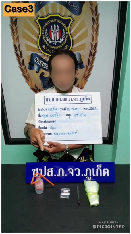 ขณะที่คดีที่ 3 จับกุมตัว นายธนชัย หรือสอง แซ่ซาน อายุ 25 ปี พร้อมด้วยของกลาง ยาไอซ์ น้ำหนัก 0.08 กรัม โดยกล่าวหาว่า “มียาเสพติดให้โทษประเภท1 (ไอซ์) ไว้ในครอบครองโดยไม่ได้รับอนุญาต” จับกุมที่ ม.3 ต.วิชิต อ.เมือง จ.ภูเก็ต จึงได้ควบคุมตัวผู้ต้องหานำส่ง พนักงานสอบสวนสภ.วิชิต เพื่อดำเนินการตามกฎหมาย