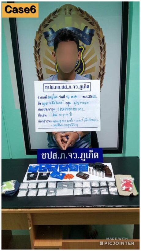 และคดีที่ 6 จับกุมตัว นายจรัสพงศ์ หรือโอม บุญพรหม อายุ 29 ปี พร้อมด้วยของกลาง ยาไอซ์ น้ำหนัก 150.48 กรัม ยาบ้า จำนวน 1,800 เม็ด อาวุธปืน จำนวน 1 กระบอก กระสุนปืน จำนวน 5 นัด เครื่องชั่งนำหนักดิจิตอล จำนวน 1 เครื่อง โทรศัพท์มือถือ จำนวน 1 เครื่อง โดยกล่าวหาว่า “มียาเสพติดให้โทษประเภท1 (ไอซ์,ยาบ้า) ไว้ในครอบครองเพื่อจำหน่ายโดยไม่ได้รับอนุญาต มีอาวุธปืนและเครื่องกระสุนปืนไว้ในครอบครองโดยไม่ได้รับอนุญาตและพาอาวุธปืนไปในเมือง หมู่บ้าน หรือทางสาธารณะ โดยไม่ได้รับอนุญาต ” สามารถจับกุมได้ที่ ต.ตลาดใหญ่ อ.เมือง จ.ภูเก็ต จึงได้ควบคุมตัวผู้ต้องหานำส่ง พนักงานสอบสวนสภ.เมืองภูเก็ต เพื่อดำเนินการตามกฎหมายต่อไป