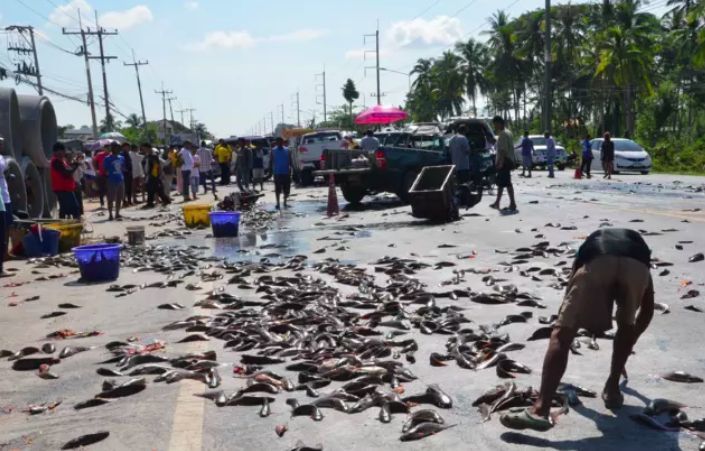 เมื่อเช้าวันนี้ (21 พ.ค.) เกิดเหตุรถชน 7 คันซ้อนบนถนนสายนครศรีฯ-ปากพนัง หน้าสำนักงานธนาคารออมสิน ภาค 17 อ.เมือง จ.นครศรีธรรมราช ทำให้มีผู้เสียชีวิต 1 รายและผู้บาดเจ็บอีก 9 ราย โดยทั้งหมดนี้ เป็นรถจักรยานยนต์ 2 คัน เป็นรถยนต์ 5 คัน โดยหนึ่งในนี้เป็นรถกระบะบรรทุกปลาดุกหนัก 1.5 ตัน ทำให้ปลาดุกตกกระจายเกลื่อนถนน
