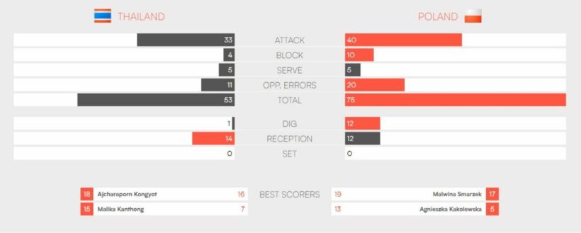 จากตารางคะแนน ทีมไทย อัจฉราพร คงยศทำคะแนนหลักได้ 16 คะแนน รองลงมาคือ มลิกา กันทอง 7 คะแนน และอรอุมา 6 คะแนน ส่วนทีมชาติโปแลนด์ ยังคงเป็น สมาเซ็กที่ทำคะแนนหลักอย่างต่อเนื่องฟาดไปคนเดียว 19 คะแนน ขณะที่เมื่อดูรูปแบบการทำคะแนน จะพบว่า โปแลนด์เหนือกว่าทั้งเกมบุก และเกมสกัดกั้น โดยสามารถบล็อกไปได้ถึง 10 คะแนน และไทยเป็นฝ่ายทำเสียเยอะกว่าถึง 20 แต้ม ส่วนเกมส์เสิร์ฟนั้นเท่ากันที่ 5 คะแนน