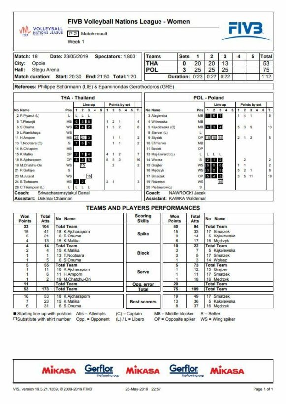 ตารางสรุปการทำคะแนนของทีมชาติโปแลนด์-ไทย เนชั่นส์ ลีก 2019
