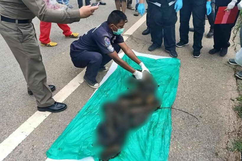 ที่เกิดเหตุพบซากศพ ถูกห่อหุ้มด้วยเสื่อน้ำมัน หมกอยู่ในพงหญ้าริมถนน สภาพศพเน่าเปื่อยเหลือแต่โครงกระดูกส่ง กลิ่นเหม็นไปทั่วบริเวณ เป็นศพเพศชาย โดยตรวจพบรอยถูกตีด้วยของแข็งจนเป็นรูที่บริเวณหัวกะโหลก คาดว่าเสียชีวิตมาแล้วไม่ต่ำกว่า 1 เดือน จึงให้เจ้าหน้าที่กู้ภัยนำศพส่งให้แพทย์ชันสูตรโดยละเอียด ห่างออกไปเจ้าหน้าที่พบบ้านต้องสงสัยหนึ่งหลัง เสื่อน้ำมันที่ปูในพื้นบ้านตรงกับเสื่อน้ำมันที่ห่อหุ้มซากศพ และยังพบเสื้อและกางเกงเปื้อนคราบเลือดที่ติดแห้งอยู่ โดยพบผู้ต้องสงสัยเป็นชายอายุประมาณ 25 ปี เจ้าของบ้าน จึงขอตรวจค้นภายในบ้าน เจ้าหน้าที่จึงได้นำตัวชายคนดังกล่าวไปตรวจสอบหาดีเอ็นเอ เพื่อหาข้อมูลกำเนินคดีต่อไป