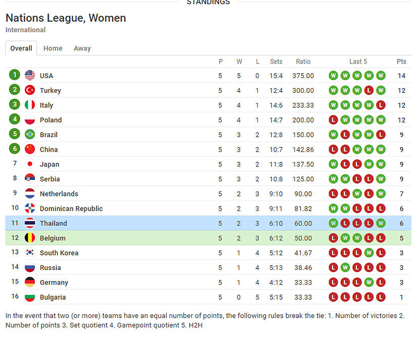 ดูสถิติก่อนเกม ไทย -เบลเยี่ยม แข่งนัดที่ 6 วอลเลย์บอล เนชั่นส์ ลีก 2019 : ข่าววอลเลย์บอล