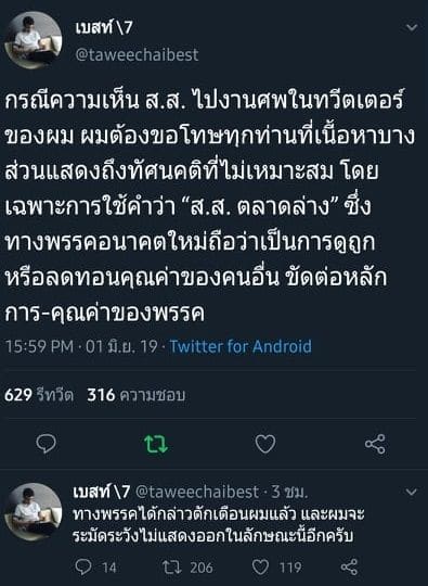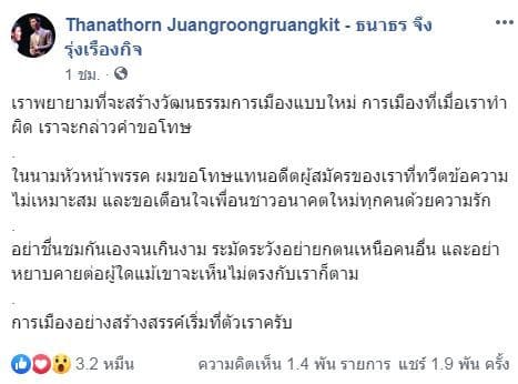 ในนามหัวหน้าพรรค ผมขอโทษแทนอดีตผู้สมัครของเราที่ทวีตข้อความไม่เหมาะสม และขอเตือนใจเพื่อนชาวอนาคตใหม่ทุกคนด้วยความรัก