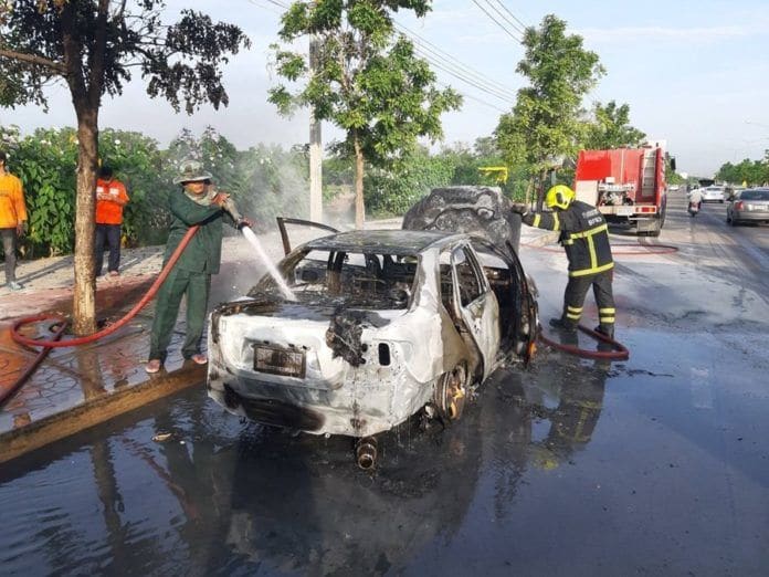ระทึก! ไฟไหม้ท่วมรถวีออส เจ้าของหนีตายหวุดหวิด