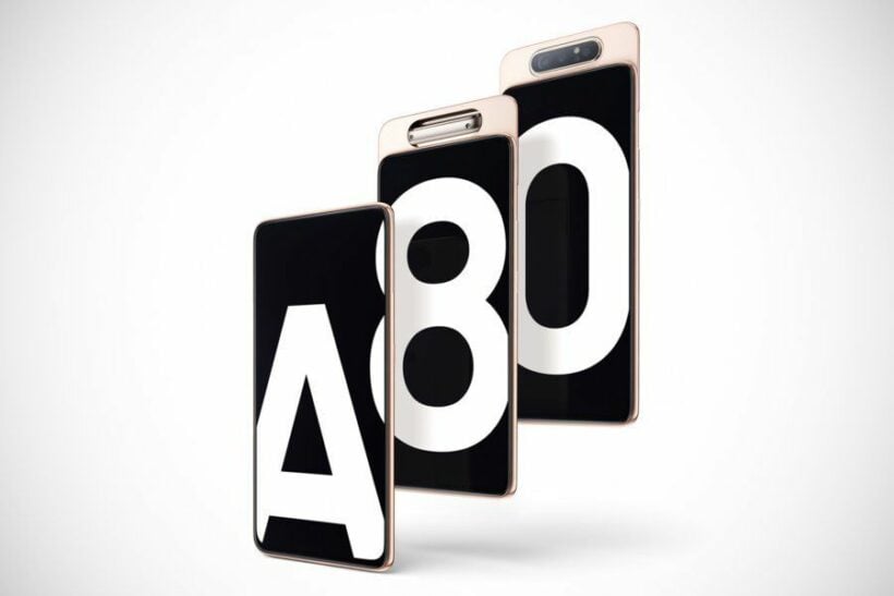 Samsung A80 เปิดตัวไปเมื่อเดือนเมษายน 2019 มาพร้อมกับจอขนาด 6.70 นิ้ว ความละเอียดที่ 1080×2400 พิกเซล ชิพเซ็ตเป็น Snapdragon 730 แรม 8GB ความจำเครื่องที่ 128GB กล้องหลังคู่ที่ความละเอียด 48 และ 8 ล้านพิกเซล กล้องหน้า เป็นการสไลด์ขอบจอด้านบนขึ้นและกล้องหลังพลิกมาด้านหน้า เป็นใช้กล้องหลังและกล้องหน้าในตัวเดียวกันนั้นเอง