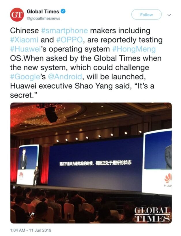 เพจทวิตเตอร์ Global Times สื่อภาษาอังกฤษรายใหญ่ของจีนได้มีการทวีตระบุว่า ตอนนี้เหล่าผู้ผลิตมือถือสัญชาติจีนอย่าง Xiaomi และ Oppo ได้เริ่มทำการทดสอบระบบปฏิบัติการ Hongmeng ของทางหัวเว่ยแล้ว ส่วนจะเปิดตัวเมื่อไหร่นั้น หัวเว่ยยังคงตอบได้แค่ว่า “มันเป็นความลับ”