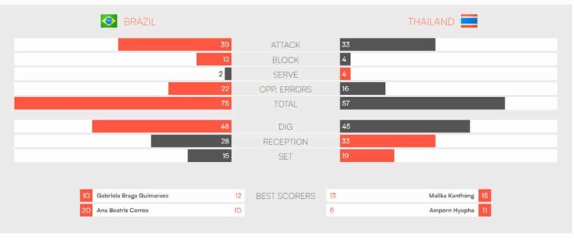 จะเห็นว่าบราซิลทำเกมบล็อกได้มากถึง 12 คะแนน ขณะที่ไทยทำเกมเสริฟได้ 4 คะแนน แต่ก็ทำเสียให้ฝ่ายตรงข้ามถึง 22 คะแนน เกือบถึง 1 เซต ผู้เล่นที่ทำคะแนนหลักให้ไทยในแมทช์นี้คือ มลิกา กันทอง ทำไป 13 คะแนน รองลงมาคือ อำพร หญ้าผา 6 คะแนน ทีมบราซิล กาบี้ ท้อปสกอร์ 12 คะแนน รองลงมาคือบอลเร็ว อนาเบียทรีซ 10 คะแนน