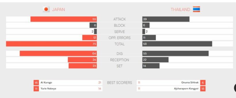 จะเห็นว่าเกมบล็อกและเสิร์ฟทำได้ดีเสมอกัน แต่ไทยทำเสียให้ญี่ปุ่นมากกว่า 1 แต้ม และญี่ปุ่นทำเกมบุกจากไทยได้เหนือกว่ามาก แมทช์นี้ เอเชี่ยนบอมบ์ อรอุมาคืนฟอร์ม ทอปสกอร์ 11 คะแนน เท่ากับอัจฉราพร คงยศ