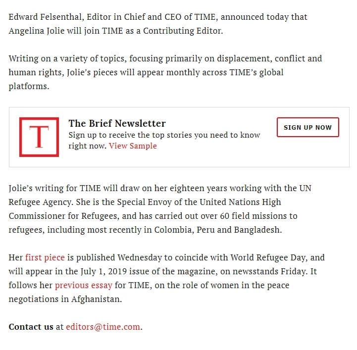 แองเจลิน่า โจลี่ : นับเป็นข่าวดีแห่งวงการบันเทิงฮอลลีวู้ด เมื่อนักแสดงมากฝีมืออย่างคุณแม่ แองเจลิน่า โจลี่ ที่ตอนนี้ได้รับการแต่งตั้งให้เป็นบรรณาธิการร่วมของนิตยสารชื่อดังระดับโลก “TIME” ซึ่งทาง เอ็ดเวิร์ด เฟลเซนธัล CEO และบรรณาธิการหลักของนิตยสาร TIME ได้ออมาประกาศผ่านทางเว็บไซต์ว่า โจลี่จะมาเป็นบรรณาธิการร่วม ดูแลในส่วนของคอลลัมน์ของการยุติความขัดแย้งและสิทธิมนุษยชน