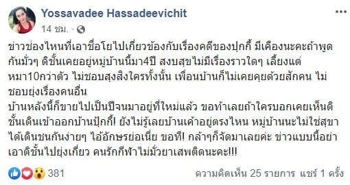“#ขออนุญาตนะคะ 2วันที่ผ่านมามีแต่เรื่องวุ่นวาย พยายามอยู่ให้นิ่งแต่เรื่องก็ไม่สงบและปานปลายไปกันใหญ่ จาก 1 ปากเป็น 10 ปาก และข่าวก็มั่วไปหมด แต่ที่ต้องขอพูดเพราะมันเริ่มมากระทบความสุขตัวเอง จะให้มานั่งรับโทรศัพท์แก้ข่าวไม่ขอทำ จะเขียนตรงนี้แล้วจบ เพราะไม่ได้มีส่วนเกี่ยวข้องใดๆ กับคดีนี้ หลังจากที่คุณปุ้กกี้โดนจับคดียาเสพติดและมีชื่ออักษรย่อออกมาหลายคน บางสำนักข่าวเขียนเหมือนรู้ดีจริงๆ ดารานางแบบ ย ที่อาศัยอยู่ในหมู่บ้านนี้ เดินเข้าออกบ้านคุณปุ้กกี้เป็นประจำและมีความเกี่ยวโยงกับคดีค้ายาเสพติด!! เอาจริงๆ..คิดได้แค่นี้เหรอคะ ไม่โกรธนะแต่โครตเสียใจจริงๆ เพราะจากชีวิตที่เป็นอยู่ก็ไม่น่าดูยากเลยนะว่าจะมีส่วนเกี่ยวข้องกันมั้ย! ข่าวช่องไหนสำนักพิมพ์ไหนที่เอาชื่อโยโยงกับเรื่องคดีของปุกกี้ อยากให้มีจรรยาบรรณสักนิด การเป็นคนในที่แจ้งก็ไม่ได้หมายความว่าจะถูกคุกคามแบบนี้ได้นะคะ โยเคยอยู่หมู่บ้านนี้จริง อยู่มา4ปี ทุกคนทราบดี ใช้ชีวิตสงบสุขไม่มีเรื่องราวใดๆ เลี้ยงแต่หมา10กว่าตัว ไม่ชอบสุงสิงกับใครทั้งนั้น เพื่อนบ้านยังไม่เคยคุยด้วยสักคน ไม่ชอบไปยุ่งเรื่องคนอื่น ที่สำคัญบ้านหลังนี้ก็ขายไปเป็นปีจนตอนนี้ย้ายมาอยู่ที่ใหม่แล้ว ขอท้าเลยนะ ถ้าใครบอกเคยเห็นโยเดินเข้าออกบ้านคุณปุ้กกี้ ยังไม่รู้เลยบ้านเค้าอยู่ตรงไหน เพิ่งรู้ก็ตอนเป็นข่าว นี่มันหมู่บ้านนะคะไม่ใช่สุขา จะได้เดินชนกันง่ายๆ ส่วนตัวไม่เคยรู้จักกัน เป็นนักร้องยุคเดียวกันก็เถอะ ไอ้อักษรย่อเนี่ย ขอที คุณทำให้ชีวิตคนๆหนึงไปตกอยู่กับข่าวแย่ๆแบบนี้ ไม่สงสารเห็นใจกันบ้างเหรอคะ โยเป็นนักกีฬามีสปอนเซอร์สนับสนุน ไปแข่งขันต่างประเทศสร้างชื่อเสียงดีๆให้บ้านเราขนาดนี้ คงไม่เอาตัวเองไปมั่วสิ่งแบบนี้ แต่วันนี้ต้องมานั่งรับโทรศัพท์ทั้งวันกับเรื่องต่ำตมมากๆ ถ้าข้อมูลที่ได้มาคือเป็นแบบนี้ บอกเลยคงจับไม่ได้หรอกคะคนชั่วเนี่ย! ขอร้อง ข่าวแบบนี้อย่าเอาโยไปยุ่งเกี่ยว นางแบบในข่าวจะเป็นใครไม่ทราบ แต่ไม่ใช่โย พูดสั้นๆคนรักกีฬาไม่มั่วยาเสพติดนะคะ!!!ใครอ่านแล้ว ขอให้พิจารณาดูเลย ว่าสิ่งที่คุณเห็นมันเป็นไปได้มั้ย! ส่วนเรื่องงาน ไม่มีผลกระทบเลยค่ะ สปอนเซอร์รับทราบตัวตนของโยดี ตรวจเลือดเช็คสุขภาพตลอด หลังจากนี้ถ้ามีการโยงถึงมาอีก จะขอดำเนินคดีตามกฏหมายนะคะ เตือนแล้วนะ! #อย่าพูดกันสนุกปากบนความทุกข์คนอื่น“