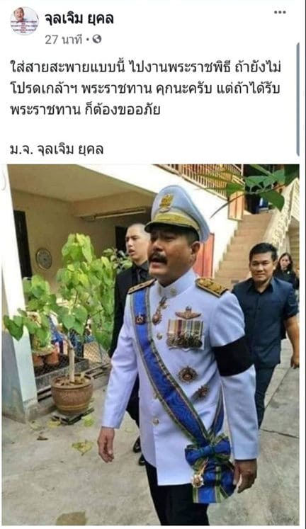 “ใส่สายสะพายแบบนี้ ไปงานพระราชพิธี ถ้ายังไม่โปรดกล้าฯ พระราชทาน คุกนะครับ แต่ถ้าได้รับพระราชทาน ก็ต้องขออภัย”
