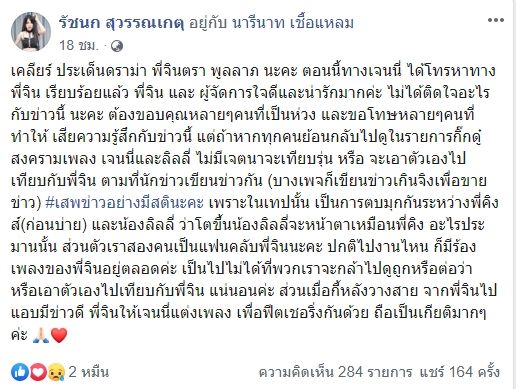 “เคลียร์ ประเด็นดราม่า พี่จินตรา พูลลาภ นะคะ ตอนนี้ทางเจนนี่ ได้โทรหาทางพี่จิน เรียบร้อยแล้ว พี่จิน และ ผู้จัดการใจดีและน่ารักมากค่ะ ไม่ได้ติดใจอะไรกับข่าวนี้ นะคะ ต้องขอบคุณหลายๆคนที่เป็นห่วง และขอโทษหลายๆ คนที่ทำให้ เสียความรู้สึกกับข่าวนี้ แต่ถ้าหากทุกคนย้อนกลับไปดูในรายการกิ๊กดู๋สงครามเพลง เจนนี่และลิลลี่ ไม่มีเจตนาจะเทียบรุ่น หรือ จะเอาตัวเองไปเทียบกับพี่จิน ตามที่นักข่าวเขียนข่าวกัน (บางเพจก็เขียนข่าวเกินจิงเพื่อขายข่าว) #เสพข่าวอย่างมีสตินะคะ เพราะในเทปนั้น เป็นการตบมุกกันระหว่างพี่คิงส์ (ก่อนบ่าย) และน้องลิลลี่ ว่าโตขึ้นน้องลิลลี่จะหน้าตาเหมือนพี่คิง อะไรประมานนั้น ส่วนตัวเราสองคนเป็นแฟนคลับพี่จินนะคะ ปกติไปงานไหน ก็มีร้องเพลงของพี่จินอยู่ตลอดค่ะ เป็นไปไม่ได้ที่พวกเราจะกล้าไปดูถูกหรือต่อว่า หรือเอาตัวเองไปเทียบกับพี่จิน แน่นอนค่ะ ส่วนเมื่อกี้หลังวางสาย จากพี่จินไป แอบมีข่าวดี พี่จินให้เจนนี่แต่งเพลง เพื่อฟีตเชอริ่งกันด้วย ถือเป็นเกียรติมากๆ ค่ะ”