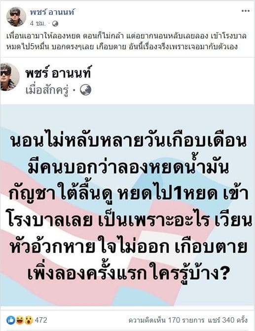 พจน์ อานนท์ : เป็นเรื่องแล้วมั้ยล่ะสำหรับผู้กำกับหนังชื่อดังอย่าง พชร์ อานนท์ ที่โหมงานหนักจนนอนไม่หลับติดต่อกันมาหลายเดือน เมื่อมีเพื่อนแนะนำให้ลองหยดน้ำมันกัญชาใต้ลิ้นช่วยรักษาอาการนอนไม่หลับได้ แทนที่อาการจะดีขึ้น กลายเป็นว่าล่าสุด (25 มิ.ย.62) เจ้าตัวออกมาโพสต์ว่ามีอาการเวียนหัว อาเจียน หายใจไม่ออกจนต้องนำส่งโรงพยาบาล หมดค่ารักษาไปเหยียบแสน