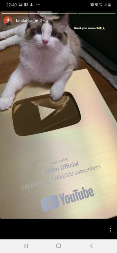 แต่ที่ล่าสุดกว่านั้นคือ สาวลิซ่า ได้ลงภาพ IG Story เป็นโล่ยูทูปทองคำ พร้อมแท็กแอคเค้าต์ @lilifilm official นั่นหมายความว่า Youtube การันตียืนยัน ผู้ติดตามลิซ่าบนยูทูปครบล้านแล้วจ้า แล้วไม่ใช่แค่ล้านปริ่ม ๆ แต่สูงถึง 1 ล้าน 2 แสนกว่า