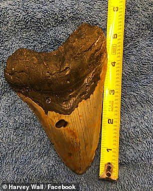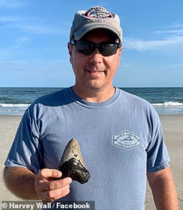 โดยซากฟันดึกดำบรรพ์ดังกล่าวถูกพบที่รัฐ North Carolinaโดยนาย Harvey Wall ชาวอเมริกัน ขณะที่เขาพาสุนัขของเขาเดินเล่นบริเวณชายหาดตามปกติ โดยเขาเล่าว่า ขณะเดินเล่นเขาก็ได้มองหาเปลือกหอยไปพรางๆ และบังเอิญพบวัตถุสีดำถูกคลื่นซัดขึ้นมา เขาไม่แน่ใจจึงลองเตะดูเบา และวัตถุดังกล่าวก็หลุดออกมาจากทรายเป็นซากฟันดังกล่าว จึงเก็ยขึ้นมาและถ่ายรูปลงเฟสบุ๊คอวดเพื่อนๆ