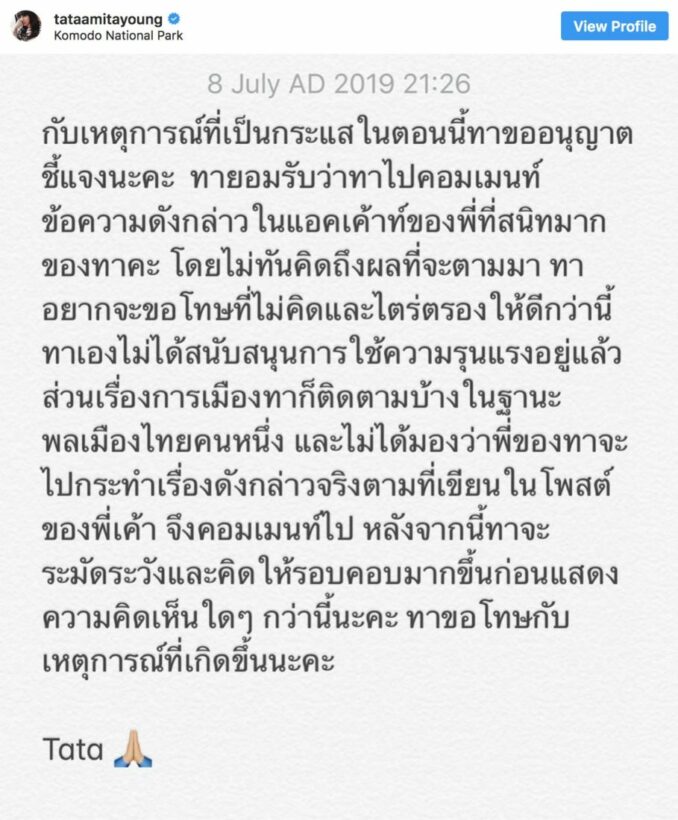 แต่ดูเหมือนว่ากระแสจะยังระอุอยู่พอสมควร ล่าสุด ลิเดีย ศรัณย์รัชต์ ได้เข้าไปโพสต์คอมเม้นต์ในอินสตาแกรมของทาทายัง ในรูปที่เธอกำลังดำน้ำอยู่ว่า “Super Cool Foto” ซึ่งไม่เกี่ยวกับประเด็นที่กำลังร้อนระอุอยู่ตอนนี้เลย แต่กลับถูกเม้นต์ด่าอย่างรุนแรง จนเจ้าตัวต้องออกมาโพสต์ระบาย แบบงงๆ อยู่ดีๆก็โดยหางเลขได้ไง