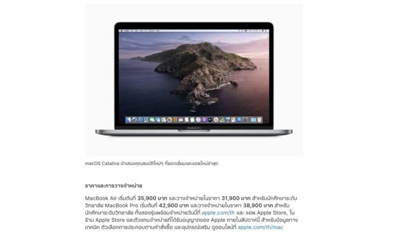 MacBook Air ที่มาพร้อมชิป CPU ใหม่ Intel Dual-Core Gen ที่ 8 ราคาเริ่มต้น 35,900 บาท ก่อนหน้านี้นั้น อยู่ที่ 42,900 บาท ส่วน MacBook Pro ปรับราคามาใหม่ เริ่มต้นที่ 42,900 บาท เท่าเดิม เพิ่มเติมคือสเปคที่ได้มา เหมือนว่าจ่ายราคาธรรมดา แต่ได้สเปครุ่นท็อป อะไรประมาณนี้
