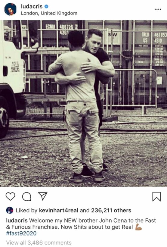 ส่วนอีกหนึ่งนักแสดงที่มีข่าวลือมานานว่าจะเข้าร่วมจักรวาล Fast นั่นคือ John Cena และเพื่อไขข้อสงสัย ล่าสุดเมื่อไม่กี่วันมานี้ หนึ่งในทีมนักแสดงอย่าง ลูดาคริส ได้โพสต์ภสพลง IG ส่วนตัวของเขา เพื่อเป็นการต้อนรับสมาชิคใหม่เข้าสู่จักรวาล Fast นั่นคือ John Cena พร้อมแค็ปชั่น “Welcome my NEW Brother John Cena to the Fast & Furious Franchise. Now Shits about to get real #fast92020”