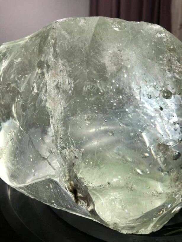 “ลักษณะเด่น : เป็นควอตซ์ใสผลึกสมบูรณ์ตามธรรมชาติ ไม่ได้ขัดแต่งหรือเจียระไนใด ๆ สังเกตดี ๆ จะเห็นว่ามีฟองน้ำใส ๆ อยู่ด้านในของตัวหิน มีโอกาสเกิดได้น้อยมาก หายากและมีค่ามากและราคาสูงกว่าควอตซ์ทั่วไป