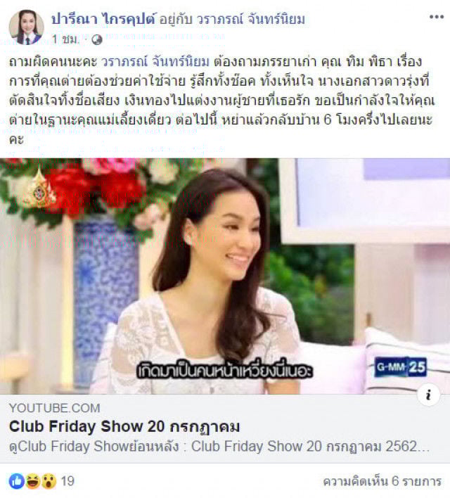 จากกรณี ปารีณา ไกรคุปต์ ส.ส.ราชบุรี พรรคพลังประชารัฐ ได้โพสต์เฟซบุ๊กพร้อมแปะคลิปรายการคลับฟรายเดย์ ที่ ต่าย ชุติมา อดีตดาราสาว สัมภาษณ์ถึงเรื่องราวความรักกับอดีตสามี ทิม พิธา ส.ส.พรรคอนาคตใหม่ ทั้งกรณีข้อตกลงห้ามกลับบ้านหลัง 6 โมง และอื่น ๆ โดยปารีณาแสดงความเห็นว่า