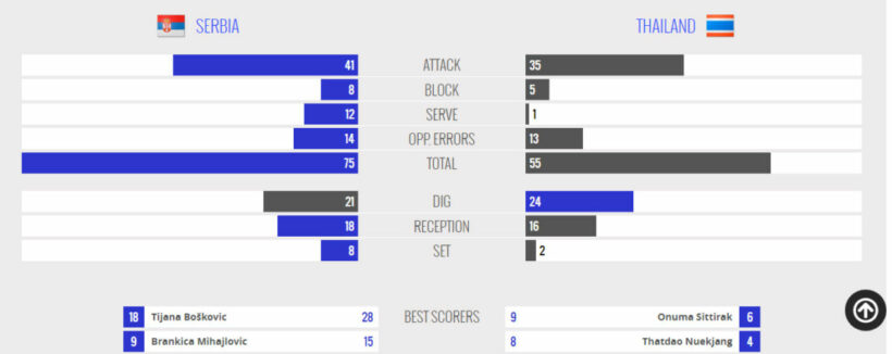 เปิดมาเซตแรกเซอร์เบียมาโหด เอสกระหน่ำ เก็บชัยเหนือไทยไปอย่างง่ายดาย แต่เซตที่ 2 สาวไทยเครื่องร้อน รูปเกมดีขึ้น สามารถนำเซอร์เบียได้ช่วงกลางเซต ก่อนที่ท้ายเซตเซอร์เบียจะอาศัยฟอร์มบุกที่เหนือกว่าของบอสโควิก พลิกกลับมาชนะไปได้อีกในเซตที่ 2