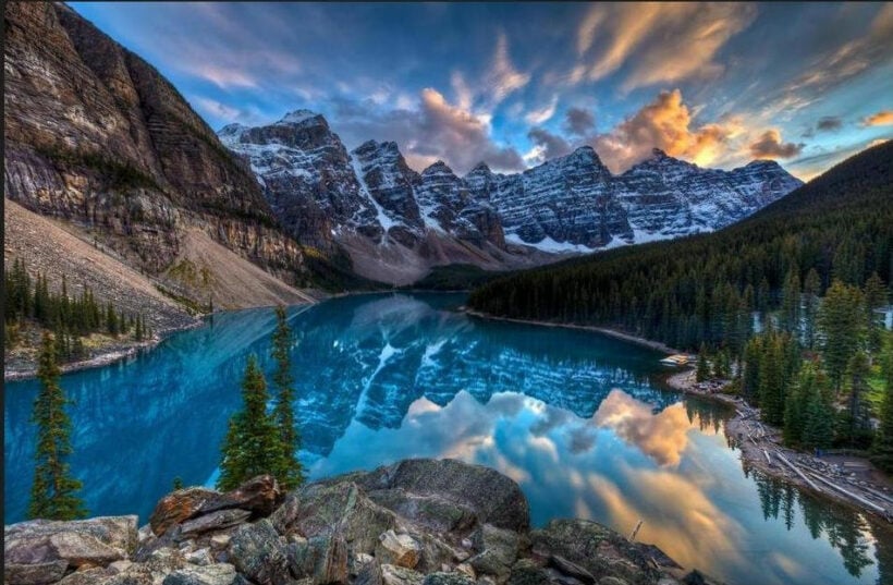 อันดับที่ 2 Moraine Lake ทะเลสาบมอเรนที่เกิดจากการละลายของธารน้ำแข็งจากอุทยานแห่งชาติ Banff National Park บริเวณเทือกเขา Rocky พื้นที่ประมาณ 0.5 ตารางกิโลเมตร ล้อมรอบด้วยวิวเทือกเขาและป่าไม้ พร้อมท้องฟ้าสีครามสดใส