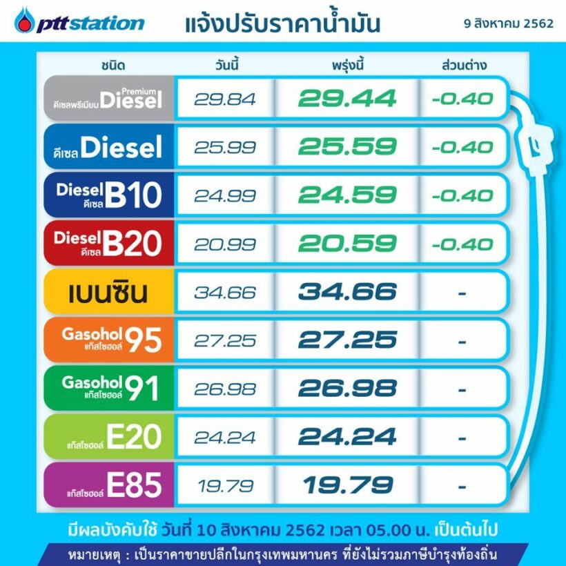 - ดีเซลพรีเมี่ยม = 29.44 บาท/ลิตร