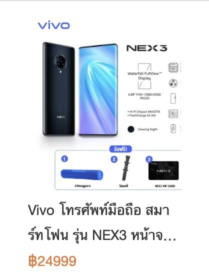 Vivo NEX 3 สมาร์ทโฟนที่มาพร้อมคุณสมบัติและสเปคระดับเรือธง ที่มีจุดเด่นอยู่ที่หน้าจอแบบ Waterfall Display ขนาด 6.89 นิ้ว แบบจอโค้งแบบไร้ขอบทั้งสองด้า มีเพียงขอบบนและล่างที่บางเฉียบ มีอัตราส่วนหน้าจอต่อตัวเครื่องมากถึง 99.6% พร้อมระบบความปลอดภัยสแกนลายนิ้วมือใต้หน้าจอ
