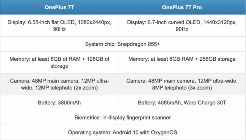 ขึ้นชื่อว่านักฆ่าเรือธง แน่นอนวันพลัสต้องสเปคมาแบบจัดเต็ม โดยคาดว่าจะใช้ชิพเซ็ตเป็น Snapdragon 855+ RAM 8GB และความจุที่ 128GB – 256GB แบะเตอรี่ 3800mAh ในรุ่นธรรมดา และ 4085mAh ในรุ่น Pro. ในส่วนของกล้อง จะมีเซ็นเซอร์หลัก 48 ล้านพิกเซล ตัวที่สอง 12 ล้านพิกเซลแบบ ultra-wide และตัวที่สาม 12 ล้านพิกเซลแบบ telephoto (2x zoom)ในรุ่นธรรมดา และในรุ่น Pro จะมีความต่างที่เลนส์ telephoto ที่จะให้ความละเอียดมาเพียง 8 ล้านพิกเซล แต่จะซูมได้ไกลกว่า 3 เท่า
