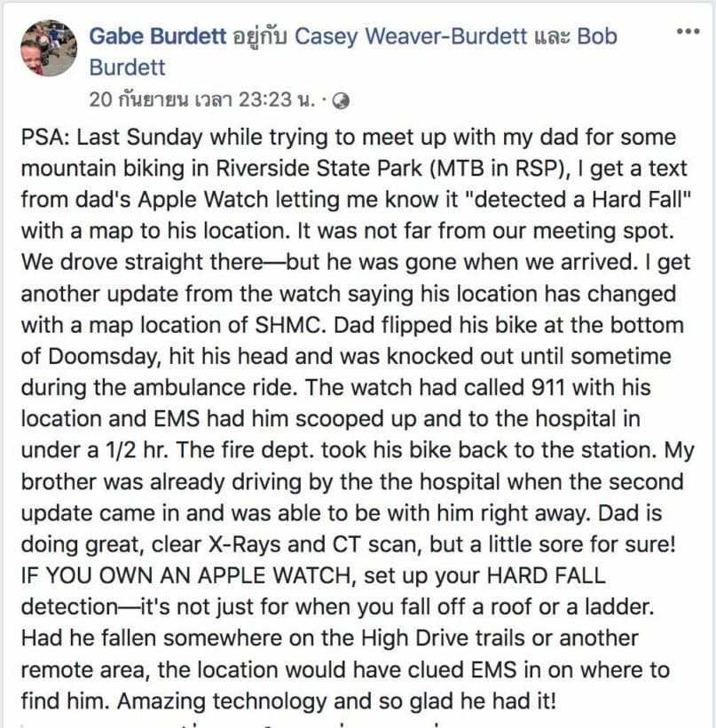 เขากับพ่อของเขานัดกันออกไปปั่นจักรยานบนภูเขาที่ Riverside State Park เมื่อวันอาทิตย์ที่แล้ว แต่อยู่ๆเขาก็ได้รับข้อความจาก Apple Watch ของพ่อของเขาว่ามีการตรวจพบการล้มอย่างรุนแรง พร้อมส่งแผนที่ตำแหน่งที่เกิดเหตุมาให้ ซึ่งไม่ไกลจากจุดนัดพบ เขาจึงรีบขับรถไปหาพ่อ เมื่อถึงที่เปิดเหตุกลับพบว่าพ่อของเขาหายไป จากนั้นเขาก็ได้รับการแจ้งเตือนจาก Apple Watch ของพ่อของเราอีกครั้งว่า ตำแหน่งของพ่อเขาอยู่ที่โรงพยาบาล