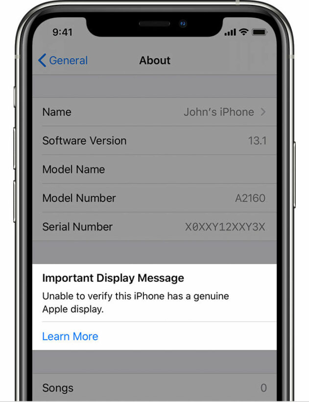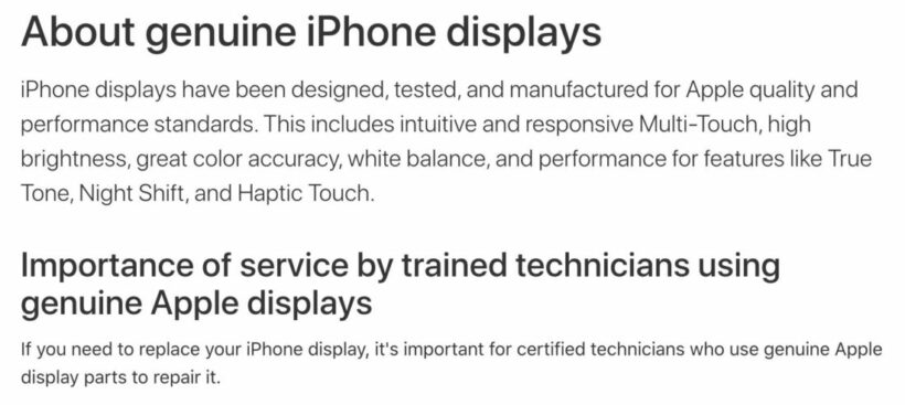 นอกจากปัญหาเรื่องการใช้อะไหล่ปลอมแล้ว Apple ยังย้ำอีกว่า “การขันน็อตหรือวางตำแหน่งอะไหล่แต่ละชิ้นผิดที่ หลังการซ่อมแซม อาจก่อให้เกิดอันตรายต่อแบตเตอรี่ ทำให้เปิดความร้อนสะสมมากซึ่งอาจเกิดอันตรายได้” ซึ่งหากตรวจพบว่าไม่ใช่จอของแท้ Apple ก็ไม่รับรองได้ว่าจะสามารถทำงานได้เต็มประสิทธิภาพใน iOS เวอร์ชั่นใหม่ เช่น Multi-touch ไม่ทำงาน, หน้าจอดับ, สีเพี้ยน, True Tone ไม่ตรง ความสว่างหรือกินแบต เป็นต้น ซึ่งก่อนหน้านี้ Apple ก็มีการออกโรงเตือนเรื่องการเปลี่ยนแบตเตอรี่ที่ไม่ใช่ของแท้เช่นกัน