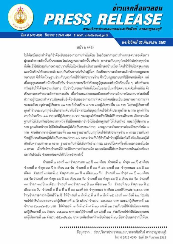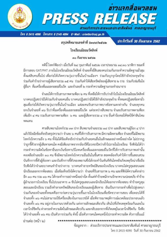 คืบหน้าล่าสุด ศาลอาญาธนบุรี ได้เผยแพร่คำพิพากษาคดีแก๊งวัดสิงห์บุกโรงเรียนวัดสิงห์ ในข้อหา ร่วมกันกระทำความผิดฐานมั่วสุมตั้งแต่สิบคนขึ้นไป เพื่อก่อให้เกิดความวุ่นวายขึ้นในบ้านเมือง ร่วมกันบุกรุกโดยใช้กำลังประทุษร้าย ร่วมกันทำร้ายร่างกายผู้เสียหายรวม 15 คน ร่วมกันทำให้เสียทรัพย์ของผู้เสียหายรวม 2 ราย ร่วมกันข่มขืนใจผู้อื่น ดื่มเครื่องดื่มแอลกอฮอล์ในวัด และจำเลยที่ 2 กระทำความผิดฐานกระทำอนาจาร โดยมีจำเลยั้งสิ้น 22 คน