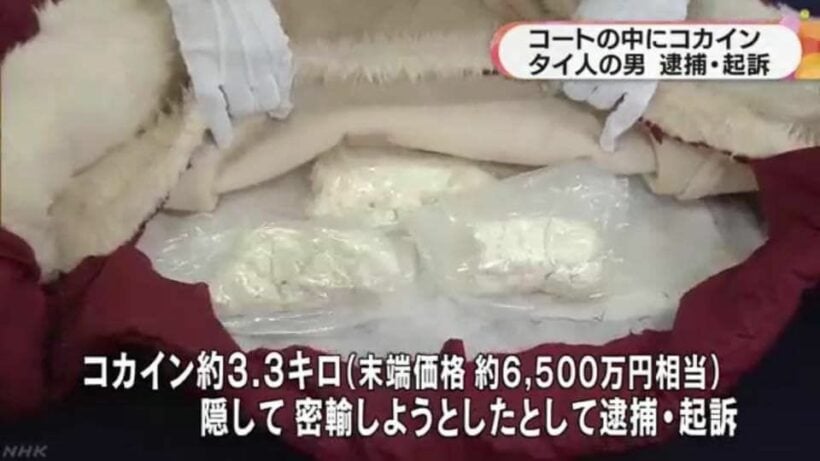 พบถุงใส่โคเคนซุกซ่อนอยู่ถึง 14 ถุง รวมหนัก 3.2 กิโลกรัม มูลค่าถึง 65.3 ล้านเยน