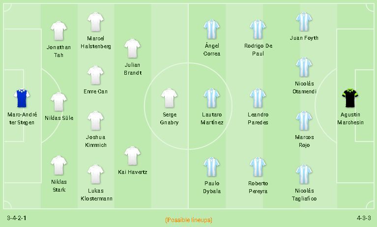 ดังนั้นเกมนี้ก็จะมีนักเตะหน้าใหม่เข้ามาสู่ทีมบ้าง โดย สคาโลนี่ จะใช้นายประตูเป็น อกุสติน มาร์เชซิน คู่เซนเตอร์จากสองทีม แมนเชสเตอร์อย่าง นิโกลัส โอตาเมนดี้ คู่กับ มาร์กอส โรโฮ ขนาบข้างด้วย ฮวน ฟอยธ์ กับ นิโกลัส ตายาฟิโก้