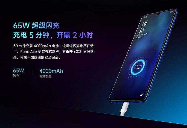 Oppo Reno Ace หนึ่งมือถือที่มีจุดเด่นที่เด่นในเรื่องของเทคโนโลยีการชาร์จไว ซึ่ง Oppo เองก็ถือว่าเป็นหนึ่งในตองอูด้านนี้อยู่แล้ว แต่ครั้งนี้ Reno Ace มาพร้อมแบตเตอรี่ 4,000mAh และเทคโนโลยี SuperVOOC 2.0 ที่ก้าวไปอีกขั้น พร้อมหัวแปลงไฟที่ที่เล็กกว่าเจ้าอื่นๆในท้องตลาด แต่สามารถรองรับกำลังไฟได้ถึง 65 วัตต์ ที่ทาง Oppo เคลมว่าสามารถชาร์จไปจาก 0-100% เต็มได้ภายในเวลา 30 นาที ชาร์จ นาที ใช้ได้ 2 ชั่วโมง อะไรทำนองนั้น.