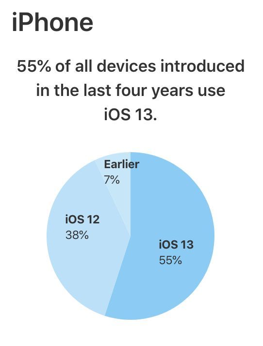 กราฟแสดงให้เห็นถึงสองกลุ่มตัวเลข โดยกลุ่มแรกเป็นตัวเลขของ iPhone ที่เปิดตัวในช่วง 4 ปีที่ผ่านมา (ตั้งแต่ iPhone 7) ที่มีการติดตั้ง iOS 13 ซึ่งมีจำนวนมาก คิดเป็นเปอร์เซ็นต์ถึง 55% และกลุ่มที่ยังไม่ได้อัพ คิดเป็น 38%.