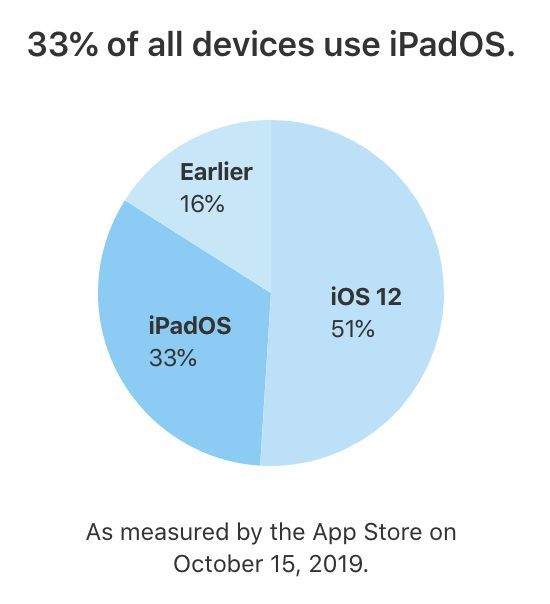 นอกจากนี้ยังมีข้อมูลการอัพเดต iPad OS บน iPad ที่เปิดตัวในช่วง 4 ปีให้หลัง(ตั้งแต่ iPad Pro 9.7 นิ้ว) โดยคิด 41% และ 51% ยังอยู่บน iOS 12. ขณะที่เปอร์เซ็นต์การติดตั้ง iPadOS บน iPad ทั้งหมดทั่วโลกคิดเป็น 33% ขณะที่ 51% ยังอยู่บน iOS 12.