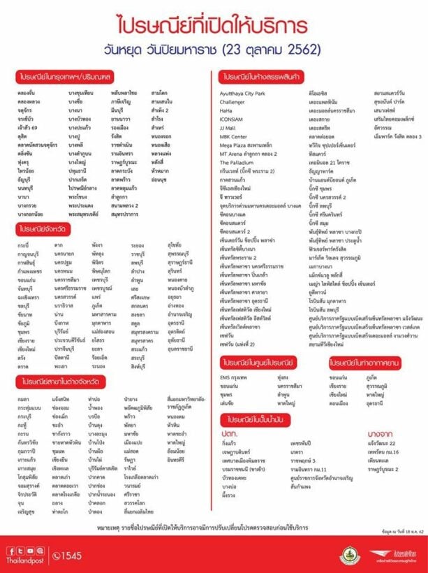วันปิยมหาราช – วันที่ 23 ตุลาคม 2562 เป็นวันปิยมาหาราช ส่วนราชการปิดทำการ แต่บริษัท “ไปรษณีย์ไทย” ไม่หยุดให้บริการประชาชน โดยเปิดสาขาในกรุงเทพแต่ต่างจังหวัดเพื่อให้บริการประชาชน โดยมีสาขาที่เปิดทำการในวันปิยมหาราช ดังนี้