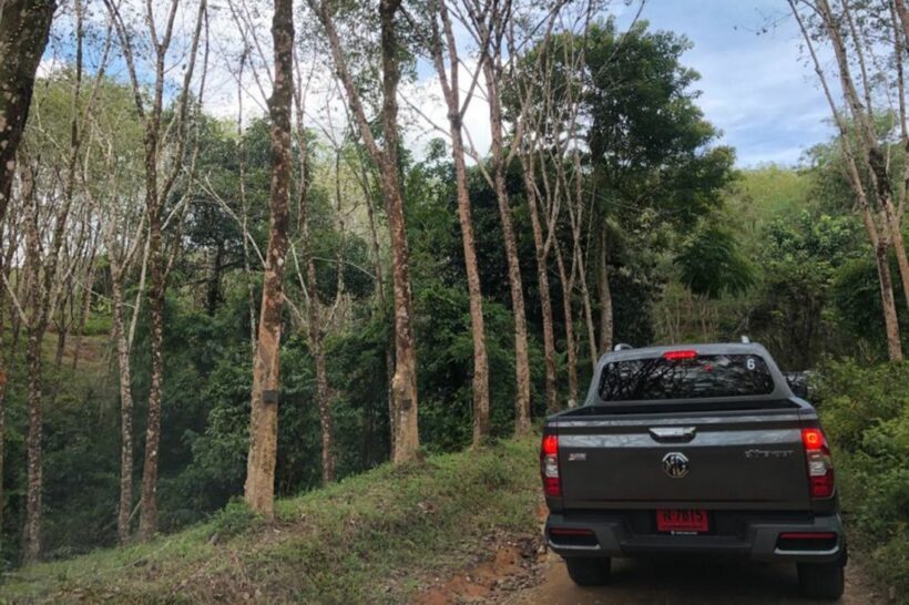 ถึงเวลาตะลุยทางเขา เราหายใจเข้าลึก ก่อนจะค่อยๆ คลานตามกันเป็นขบวนขึ้นไป ซึ่งทางก็ค่อยๆ เริ่มขรุขระขึ้นเรื่อยๆ จากที่ด้านข้างเป็นต้นยางก็เริ่มเป็นเหวลึก ทางดินที่เต็มไปด้วยก้อนหินขนาดค่อนข้างใหญ่ และหลุมร่องที่พร้อมให้ล้อตกลงไป ก็แคบจนรถกระบะผ่านได้แบบพอดีๆ ซึ่งส่วนตัวแล้ว ถ้าหากว่าขับรถซิตี้คาร์ของตัวเอง คงยืนจ๋อยอยู่ตรงตีนเขา แต่เพราะความแรงและความบึกบึนของ MG Extender ทำให้เรามั่นใจมากว่าเราจะรอดไปถึงยอดแน่ๆ เพราะหินที่ว่าใหญ่ ทางที่ว่าน่ากลัวด้านหน้า กระบะคันนี้ผ่านฉลุยได้หมด ขณะที่ผู้โดยสารยังคงนั่งกันอย่างสบายอารมณ์